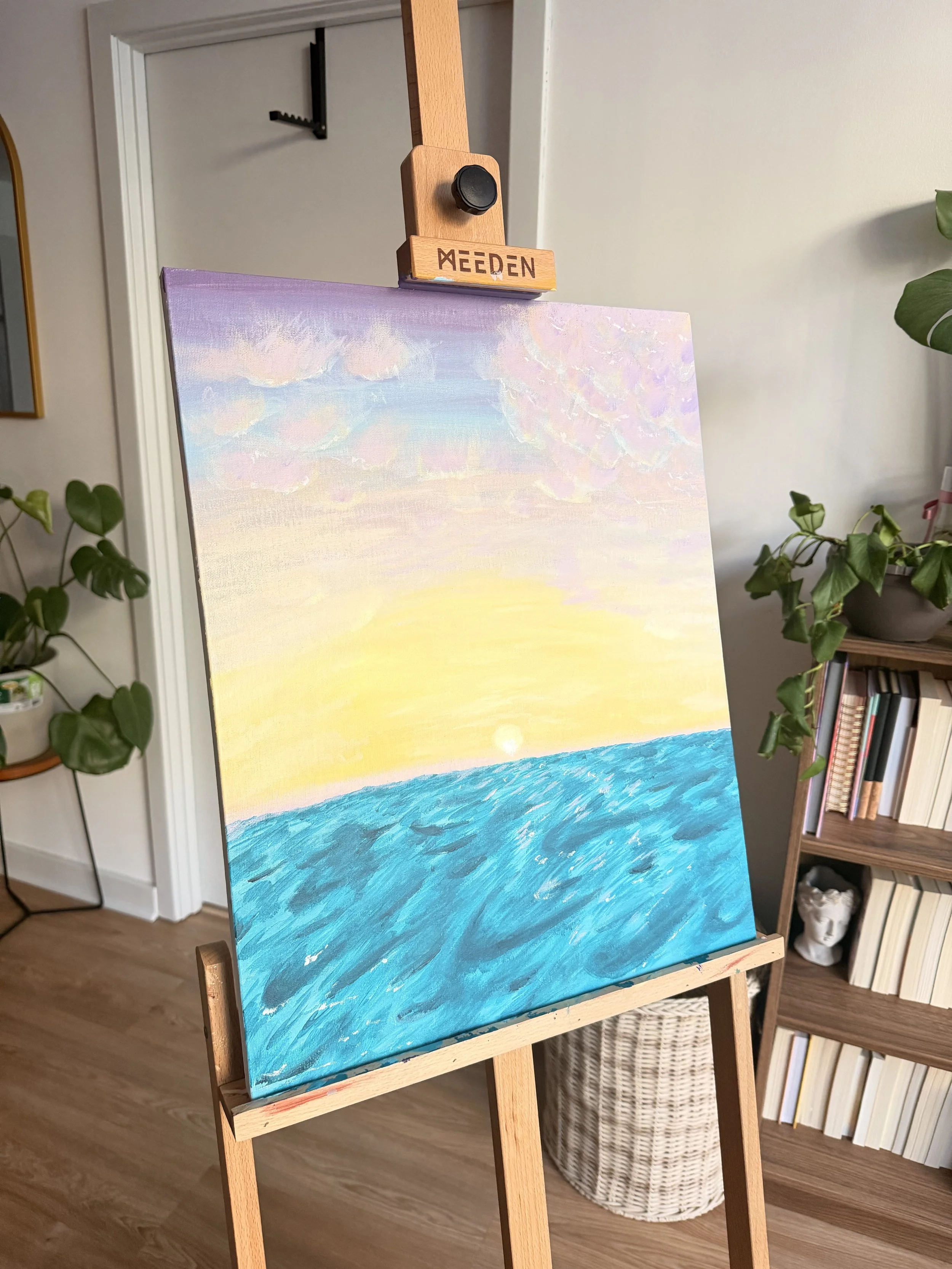 A painting of a sunrise over the ocean, with pink and purple clouds in the sky, on an easel in a room with plants and books.