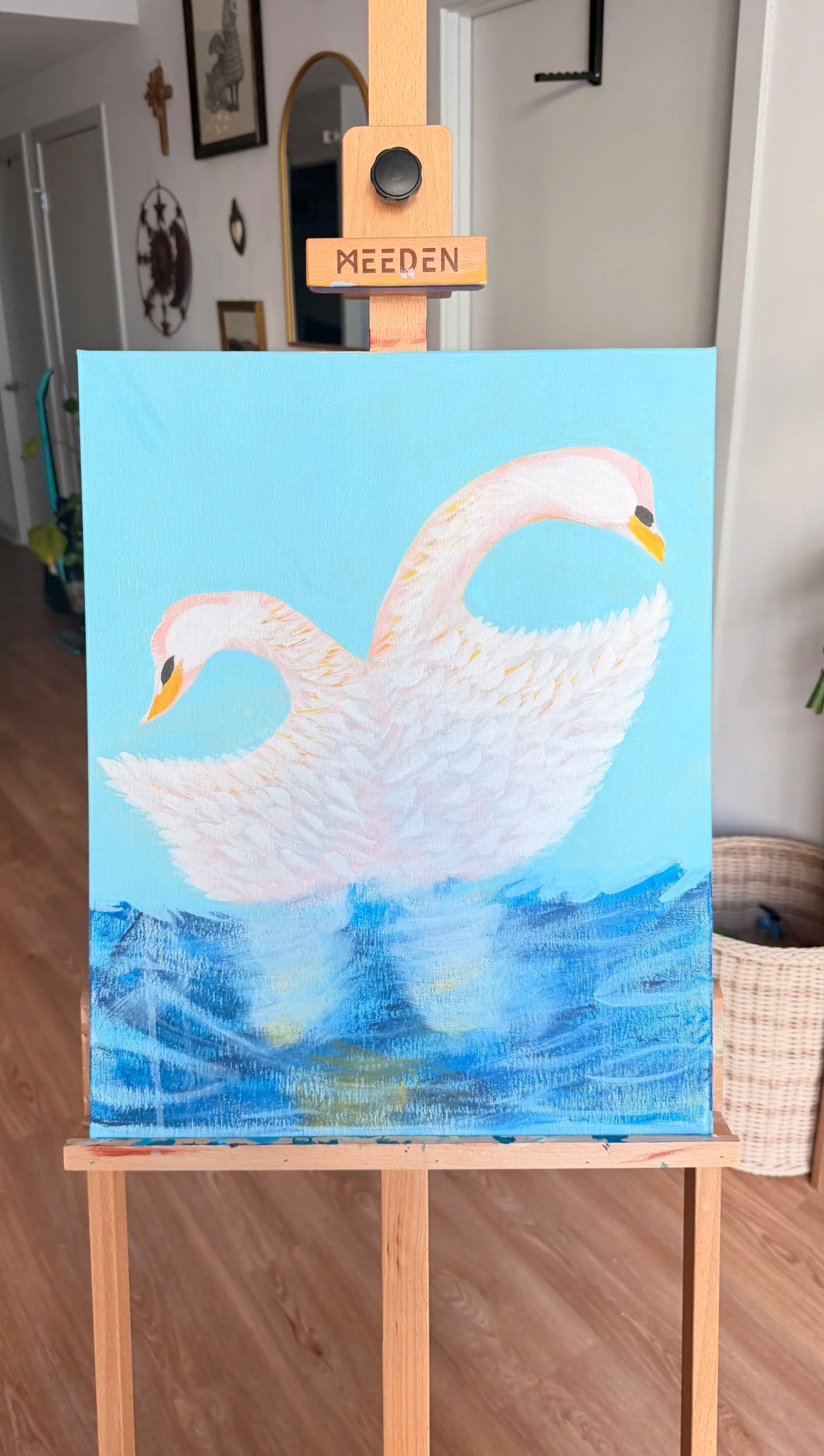 Painting of two white swans with orange beaks on blue water background displayed on an easel in a room.